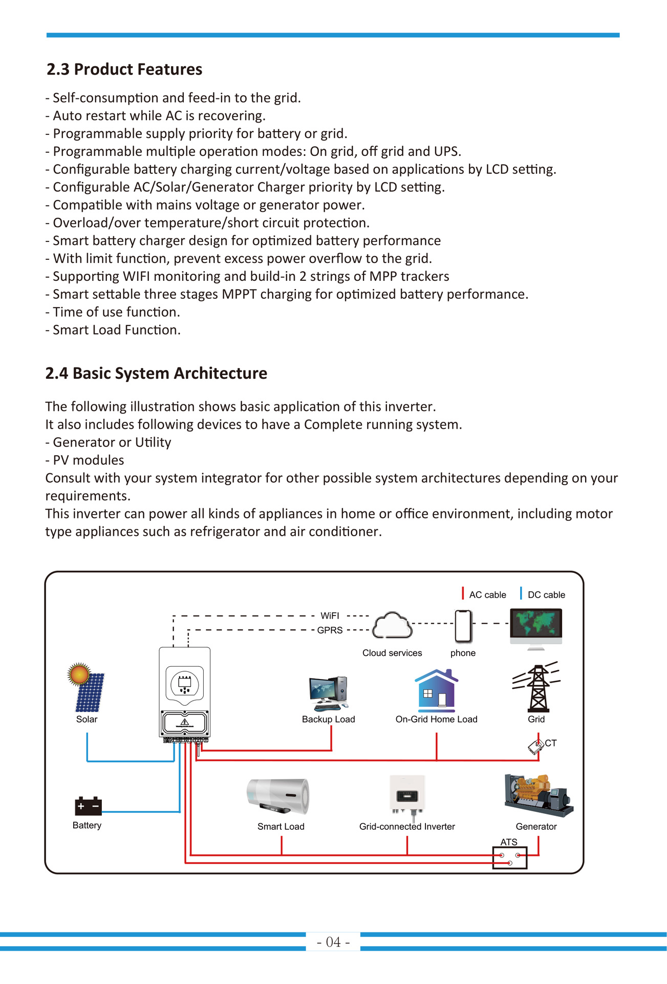 下圖顯示了這種逆變器的基本應用。它是一個完整的發電運行系統。 該逆變器可以為家庭或辦公室環境中的各種電器供電,包括電機式電器,如冰箱和空調。