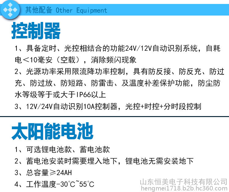 2、光源功率采用限流降功率控制,具有防反接、防反充、防過充、防過放、防短路、防雷擊、及溫度補(bǔ)差保護(hù)功能,防塵防水等級(jí)等于或大于IP66以上