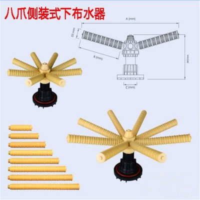 6分上下集散,1寸上下集散,4寸頂(側)裝六爪布水,4寸頂(側)裝八爪布水,6寸法蘭側裝布水,大八爪布水,雙層十六爪布水,水帽,2.5/4寸黑二通及堵頭變徑。廣泛運用于各食品,化工,冶金等水處理設備及其他機械設備。